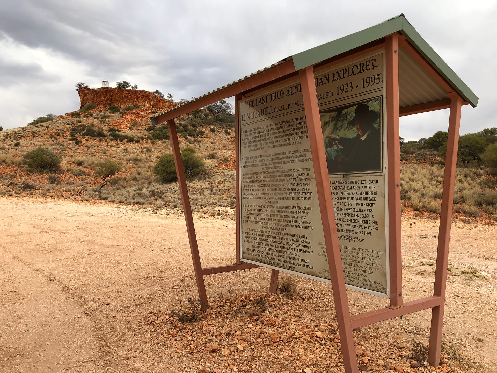 After skirting the dry Mangkili Claypan, we took the obligatory photos at one of the plaqued Len Beadell Trees before setting up camp at Geraldton Bore. Attributed to the Geraldton Historical Society, a hand pump was installed in 2007 by the Department of Environment and Conservation and some four wheel drivers to allow travellers to access the water. We found it still working well today with nice clean water (requiring just a bit of man-power to pump up). As the sign says, it may save a life: Use it. Respect it. Leave it here.